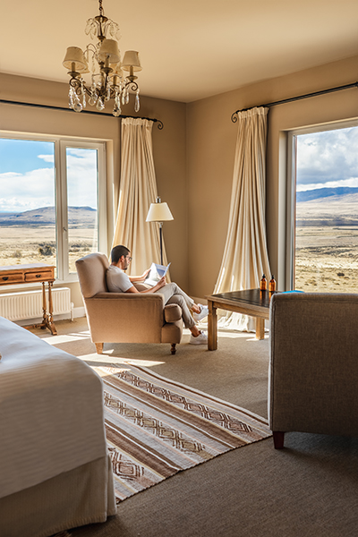 Lake, steppe and/or cordillera views. Twelve rooms, each with its unique decoration, of which 2 allow an extra bed and triple occupancy. The average surface of each room is 400 square feet.